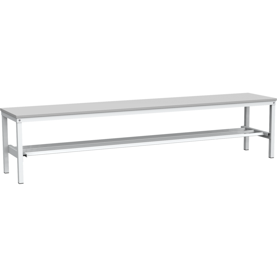 Скамья для раздевалки без спинки. Цвет: серый. Каркас - стальная квадратная труба 25х25х1,5 мм. Материал сидения - пластиковая доска 20 мм. Поставляется в разобранном виде, в компактной картонной таре. Габаритные размеры, мм: длина - 2000, ширина - 350, высота - 460